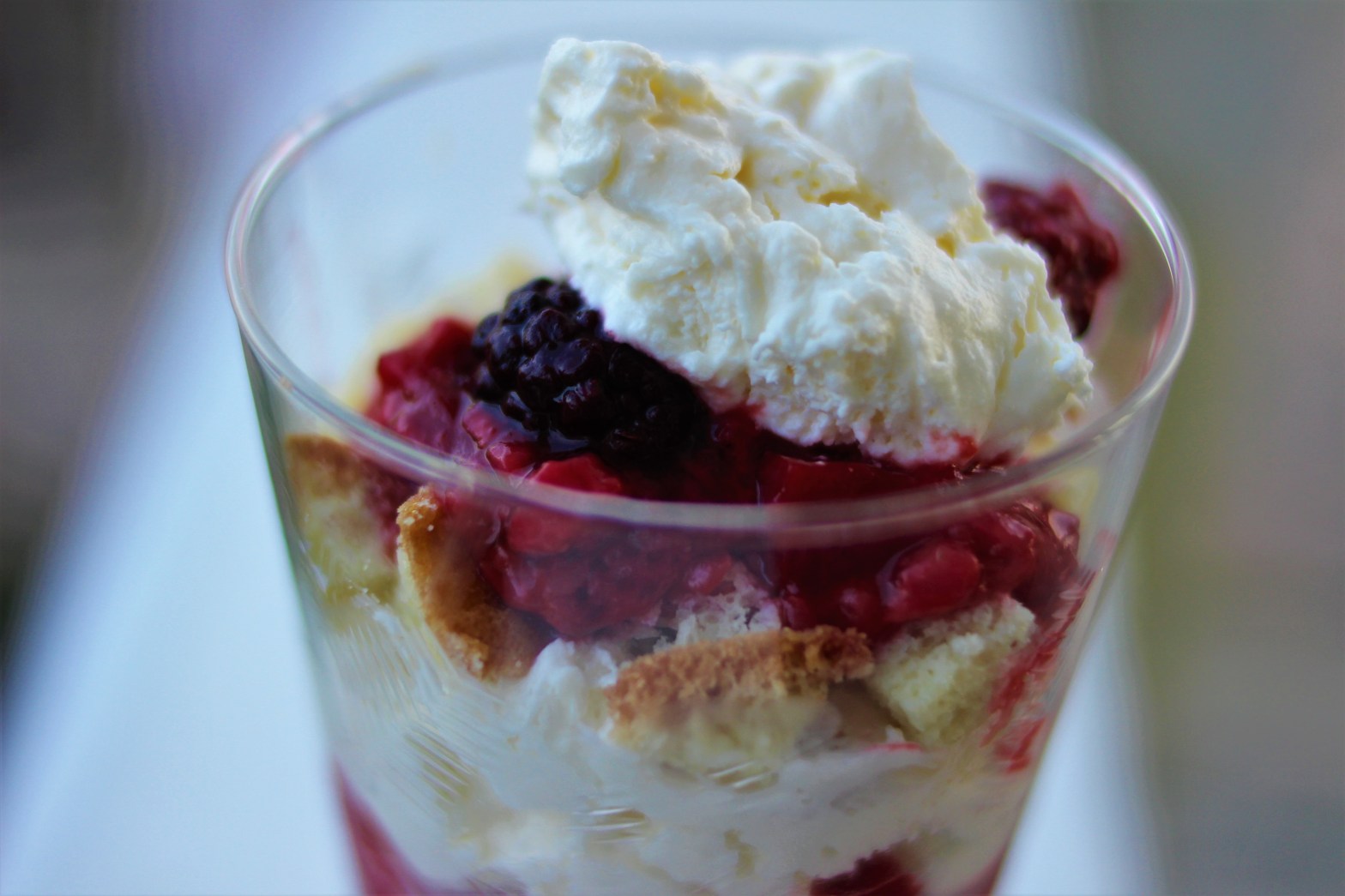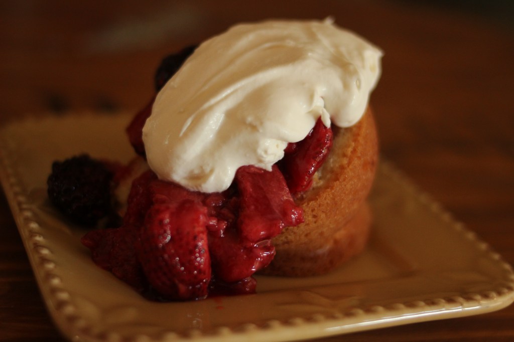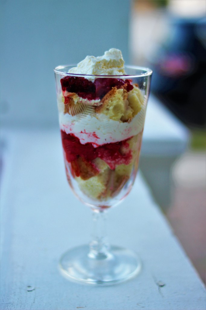 The next day was Fourth of July and we had some of the leftover dessert and I decided that I needed a better presentation to show off this light and decadent treat. My mother had some lovely parfait glasses that I then layered the cream, berries and cake in and the result was much prettier than before. Also it was a lot easier to eat and the berries, cream, and cake were more incorporated together giving you a tasty bite of all three with every bite.