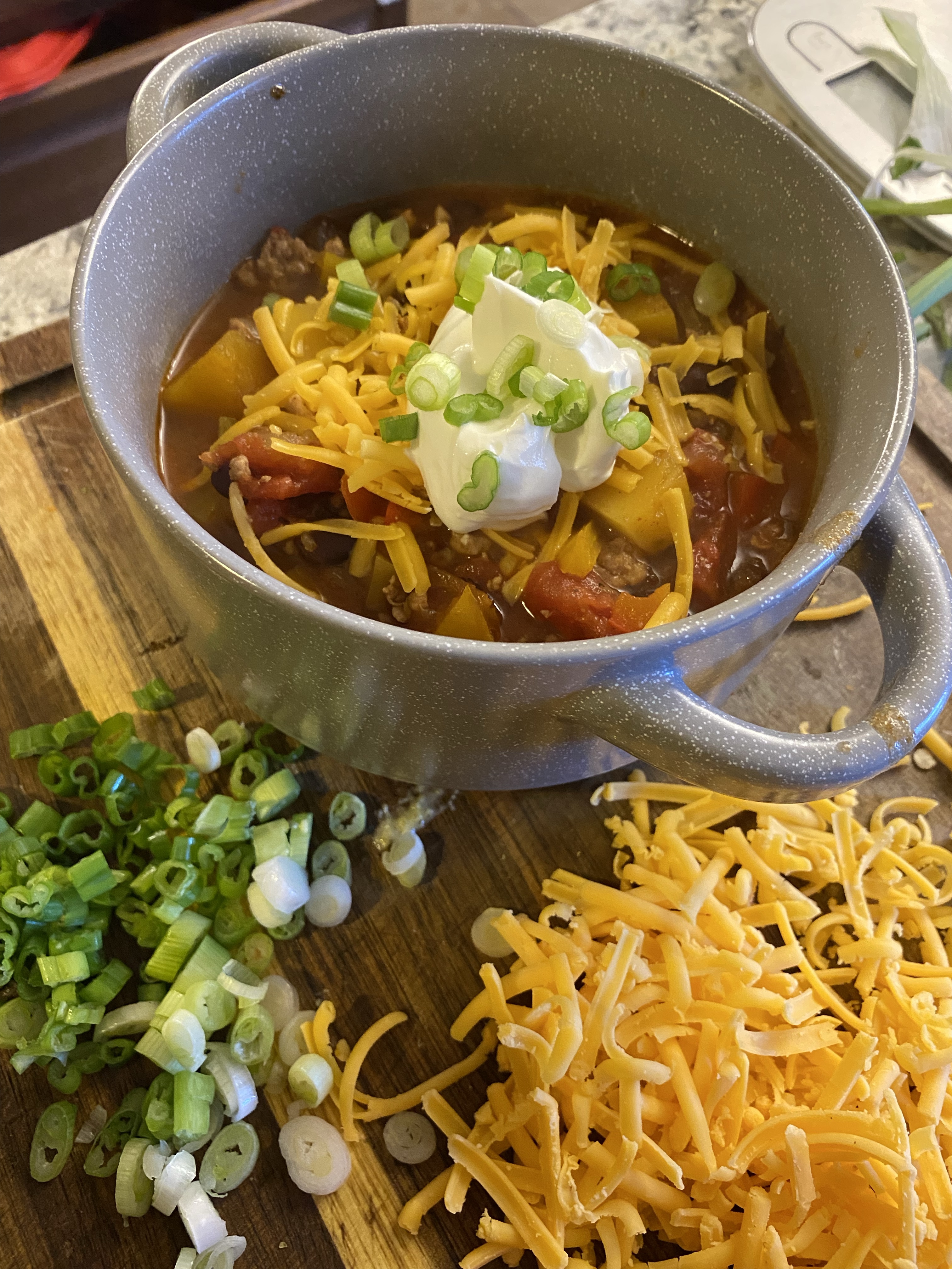 - Remove from heat and serve with shredded cheese, sour cream and/or green onions if you choose. Savor while hot!
