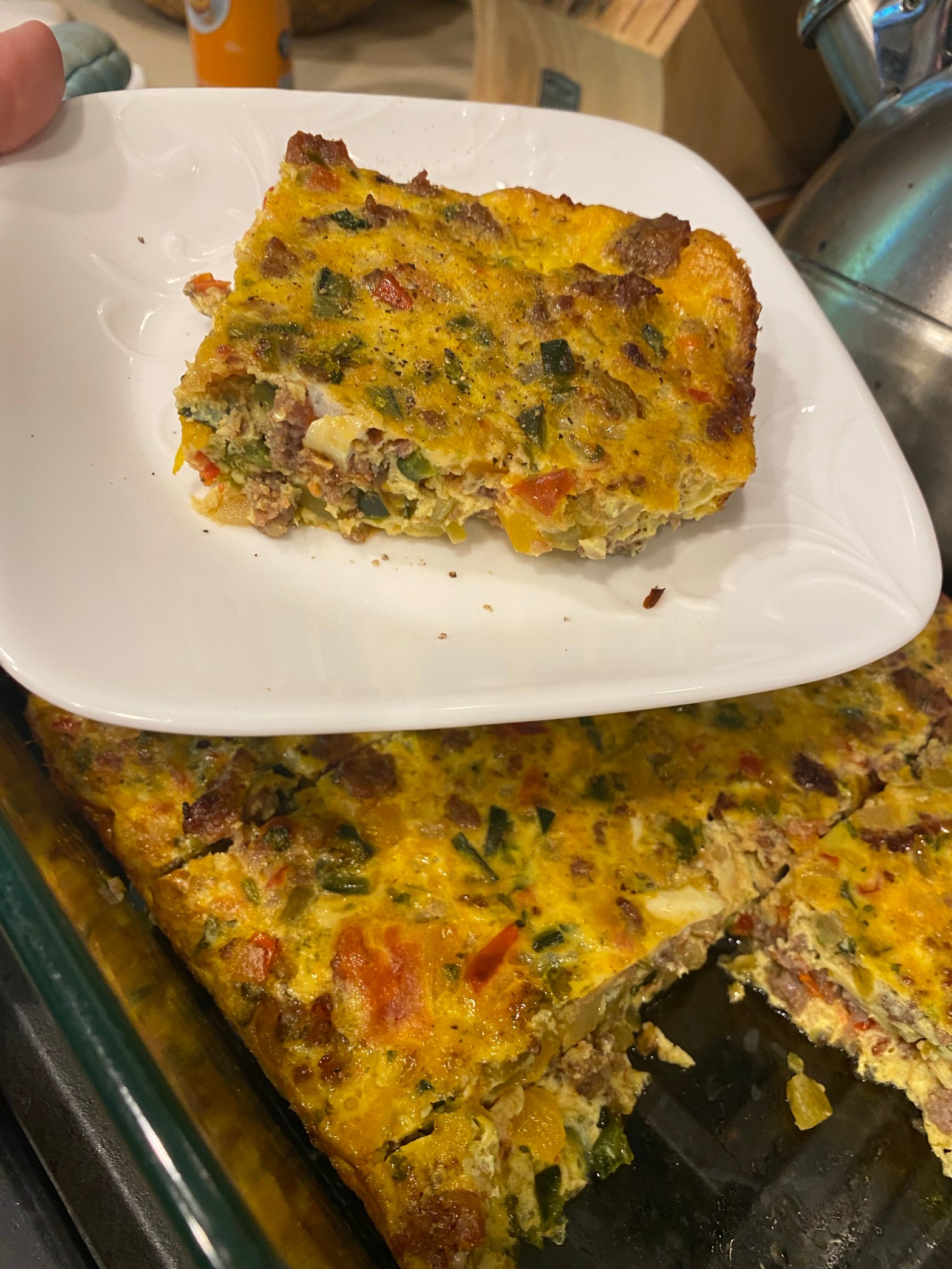 - Beat eggs, water, salt and pepper and pour on top of sausage mixture.